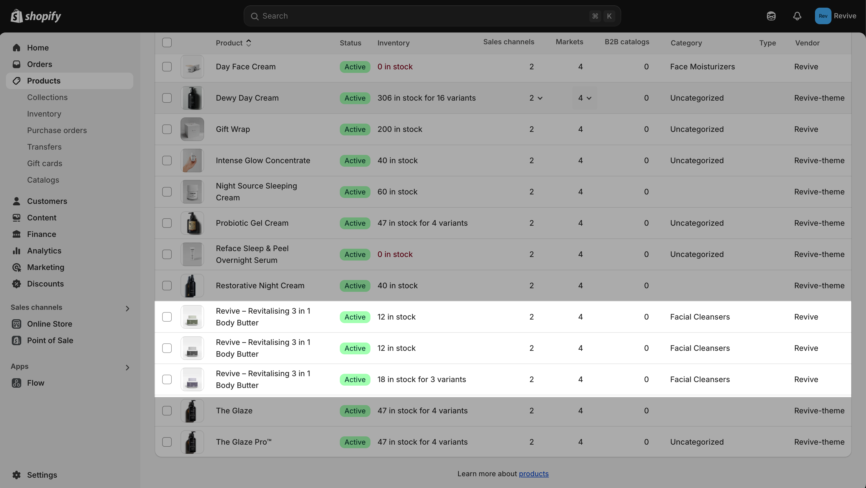 Example of individual products in product admin: