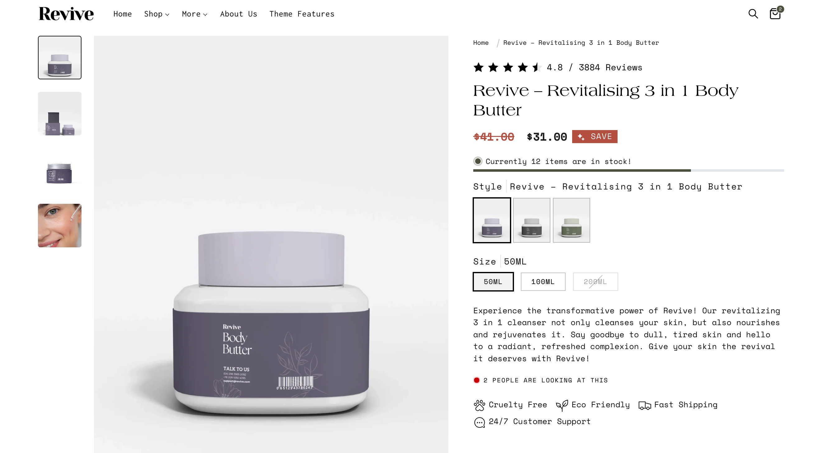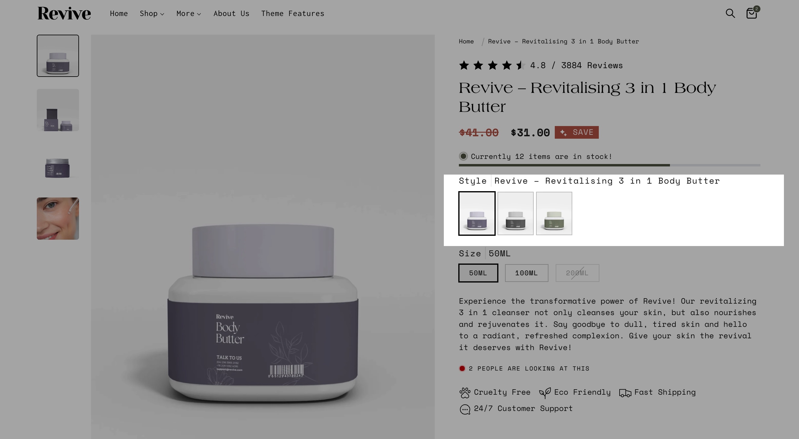 Lumin theme includes the ability to link directly to other products as product swatches. The result is rich product detail pages that include swatches with images that represent each variant option. Clicking on a swatch displays only the images associated with that variant option and also the product details and prices for the variant:
